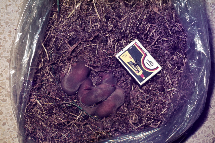 "חומרי הגלם לסדרת התצלומים קנה מידה הן שקופיות שצילם אבי במהלך למעלה מ-40 שנה, כאשר היה מורה לביולוגיה ולידיעת הארץ בסמינר אורנים ובמוסד החינוכי אשרת בקיבוץ עברון. אני מצלם מחדש את השקופיות של אבי. הוא צילם יונקים, צמחים, פטריות, מאובנים, עקבות וצנפות, וליד כולם השאיר חפץ זמין, שהיה ברשותו ברגע הצילום, כדי לייצר קנה מידה שיעיד על ממדי האובייקט המצולם. ברוב המקרים השתמש בעט הפרקר שלו, אך לעתים חרג ממנו לחפצים אחרים, כמו כובע, פטיש גאולוגי, מימיה או אולר, ובמקרה של גזעי עצים השתמש כקנה מידה באִמי או באחותי". |