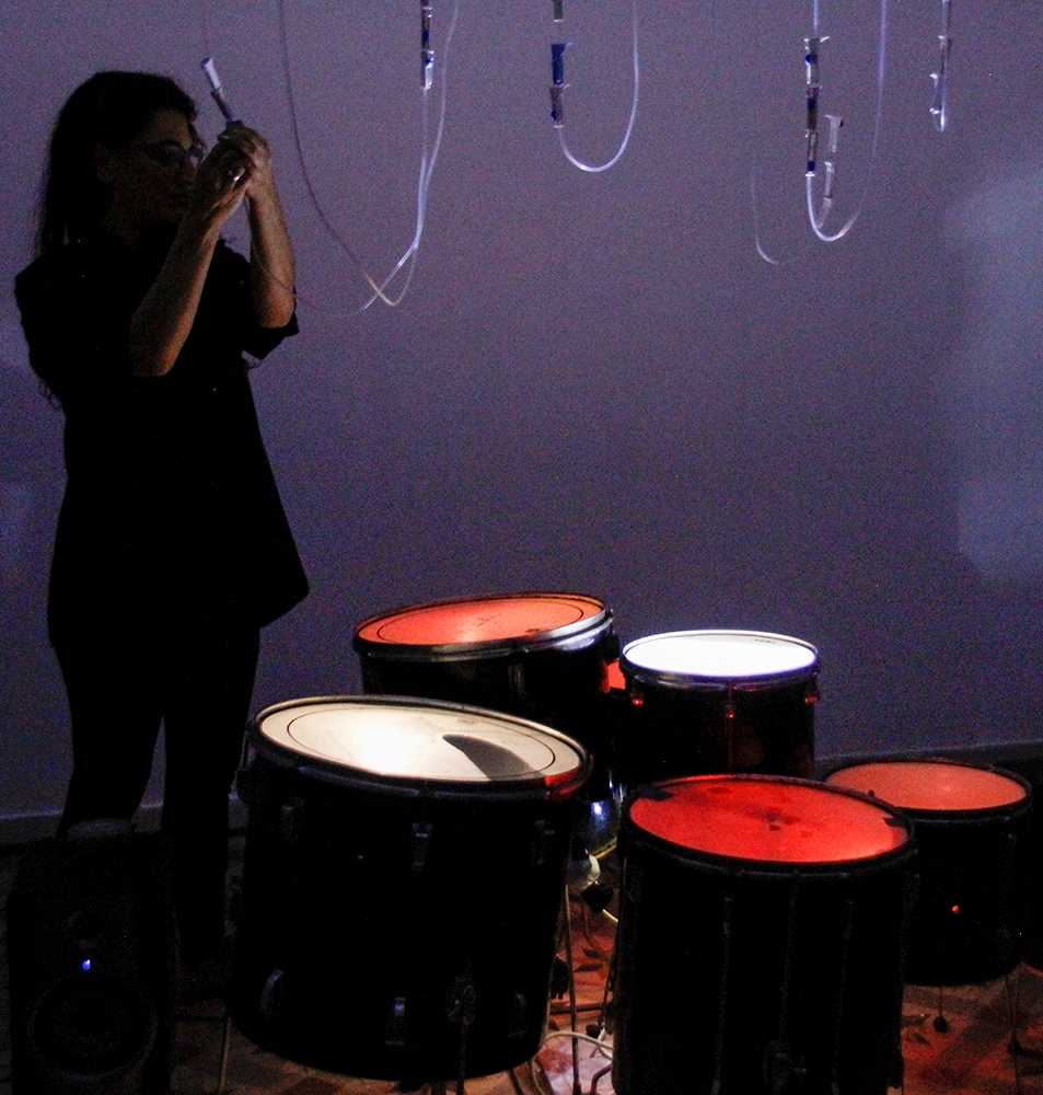 טיפות מים מטפטפות על תופים. רגעים אקוסטיים כנועים לכללי יסוד קוסמיים, למצב של מתח מתמיד בין שליטה לשחרור. הן נופלות בתדירות משתנה ומניעות אוויר שהופך לחשמל, מרטיטות את עורות התוף ומוסיפות להדהד אדוות של מים וקול, לקבל השראה, להתמסר אל ציורה של מעטפת הטיפה. בתוך פרפורמנס שנוצר בחלל המיצג, נבחן החיכוך בין אלמנטים סונוריים ופלסטיים. מיצג עירוי מבקש להדהד את המוזיקליות והקצביות הראשונית שאלמנטים אורגניים בטבע יודעים לעשות, באופן פשוט ובלתי אמצעי.